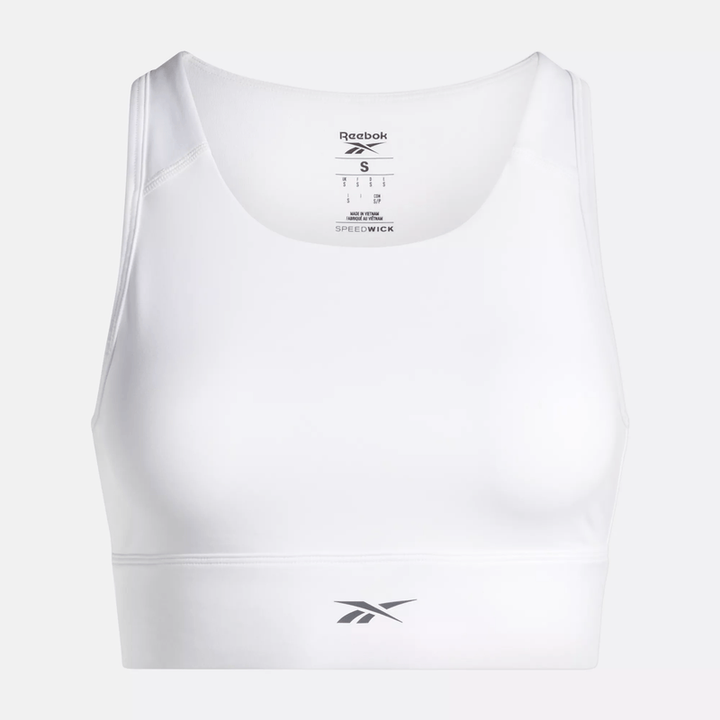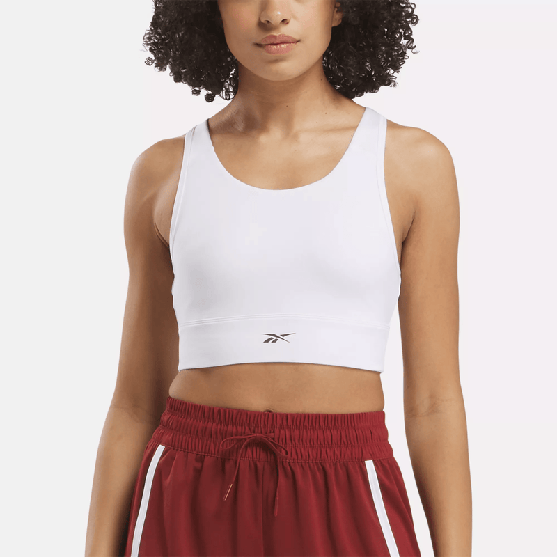 From kickboxing to HIIT, this Reebok workout bra provides high support for your most challenging sessions. A high neckline provides coverage, while a cutout in back adds feminine detail. RBK-DRY wicks sweat to keep you dry as you raise the intensity.