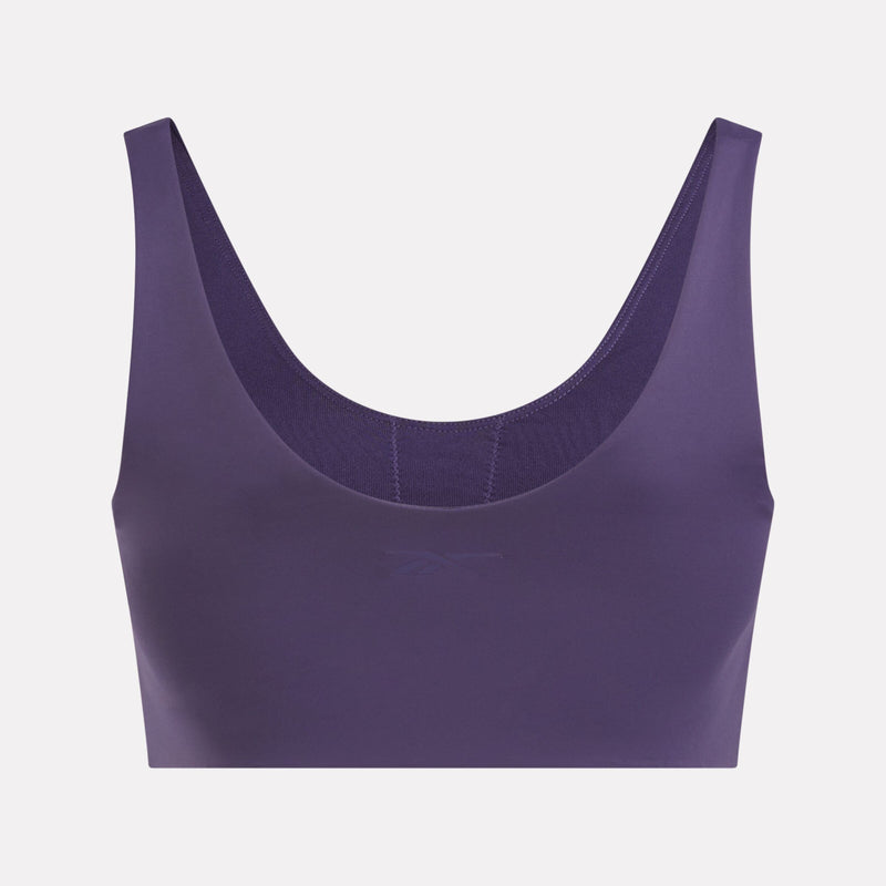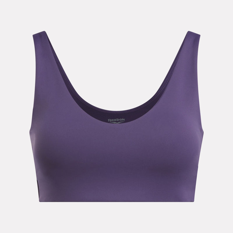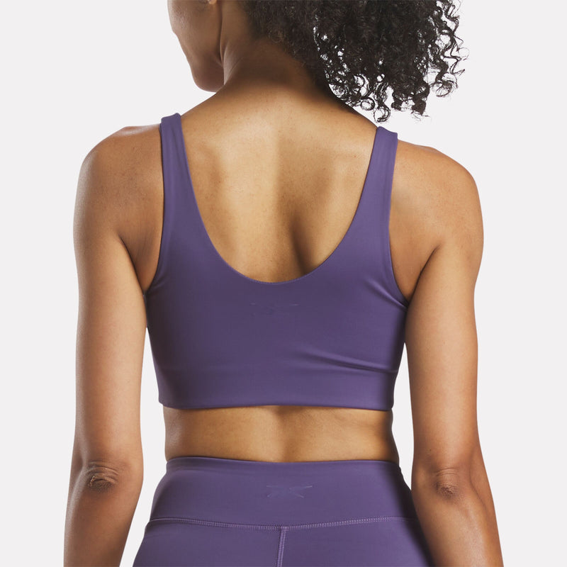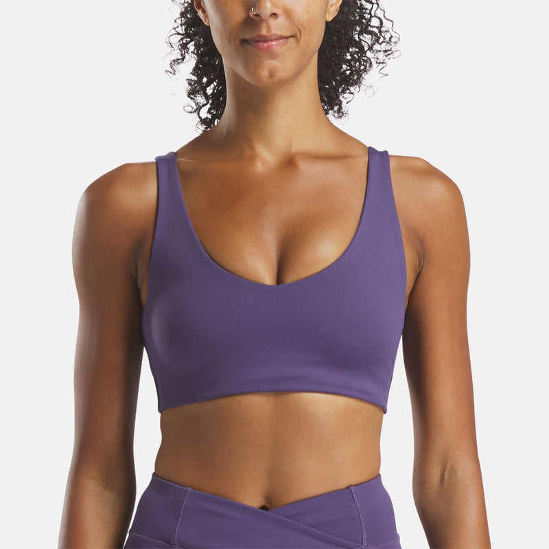 Take on the barre, bike or yoga mat. This women’s Reebok bra offers medium-impact support to help you go all in on your studio workouts. Stretchy, sweat-friendly fabric is cut with a flattering V-neck.